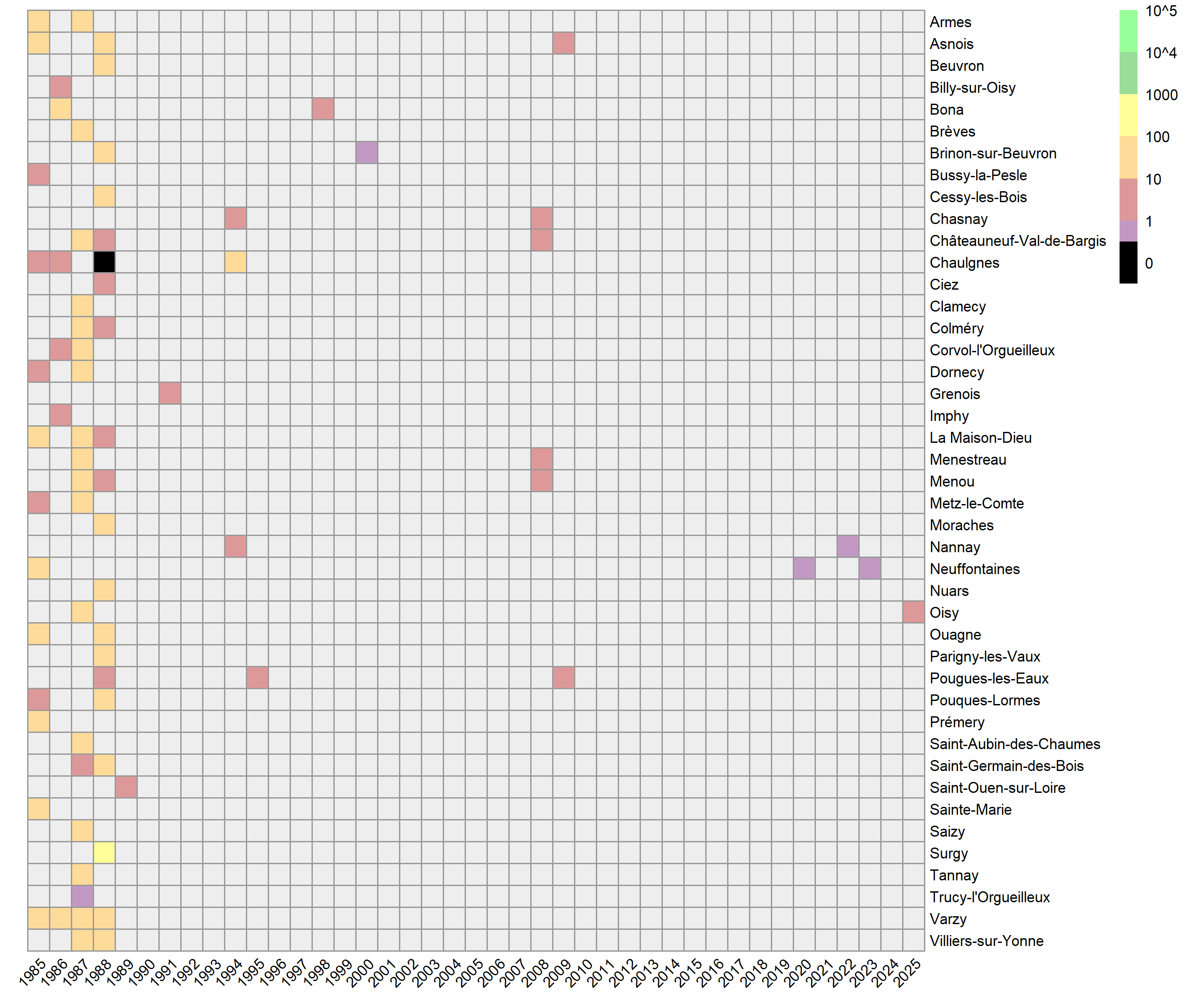 Cette espèce des ourlets forestiers calcicoles est en fort déclin et présente de longues éclipes dans l’historique des relevés. Les specimens observés sont de petite taille, et peut-être difficiles à trouver. A rechercher.